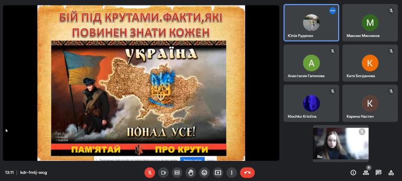 Ми пам'ятаємо подвиг українців під Крутами, пишаємося своїми Героями. Студенти нашого коледжу згадали історичні події 1918 року під час найрізноманітніших заходів, таких як: година історичної правди «Міфи та реальність про Крути»; екскурс в історію до річниці трагедії під Крутами «Героям Крут вічна слава!», урок звитяги «За Україну: від Крут до сьогодення». Пропонуємо вашій увазі фотозвіт про проведені заходи.