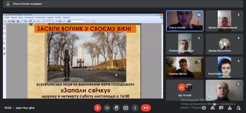 До 90-х роковин Голодомору в нашому коледжі проведено низку виховних заходів: уроки пам’яті «Без права на забуття», «Пам’ятаємо, не забудемо, розповімо», інформаційну годину «Голодомор мовою документів», круглий стіл «Голодомор в Україні: злочин влади – трагедія народу». Сьогодні Голодомор – це велика духовна рана, яка пронизує нестерпним болем пам’ять і його очевидців, і сучасне покоління. Геноцид українського народу став страшною сторінкою історії, але не зламав прагнення української нації жити в гідності та свободі.