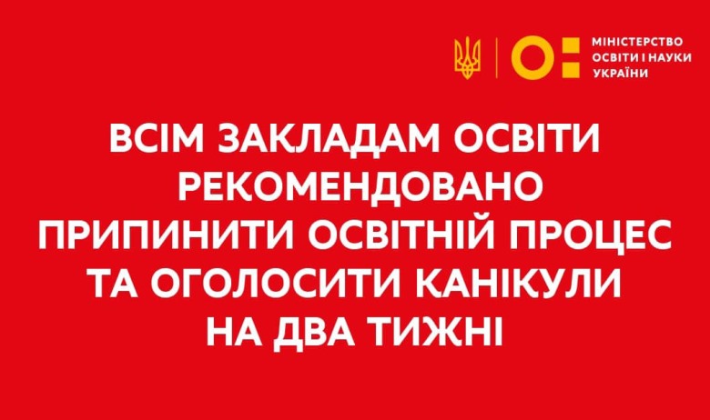 З метою убезпечення всіх учасників освітнього процесу МОН направило листа керівникам закладів професійної, фахової передвищої та вищої освіти з рекомендацією щодо припинення освітнього процесу в усіх закладах освіти та оголошення канікул на два тижні.