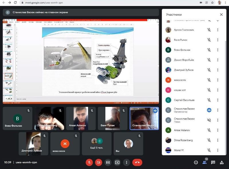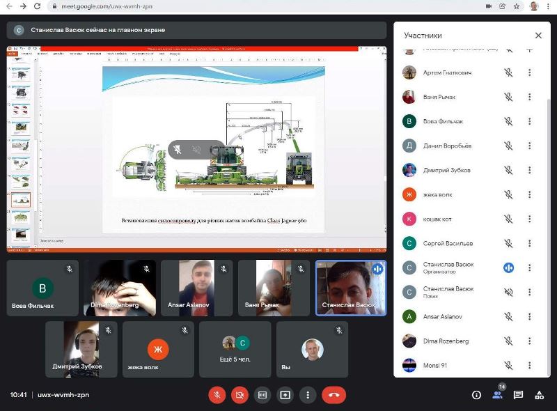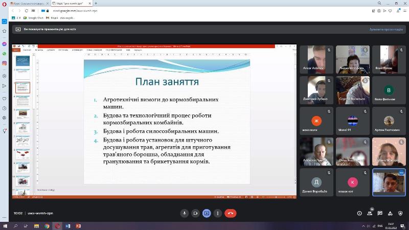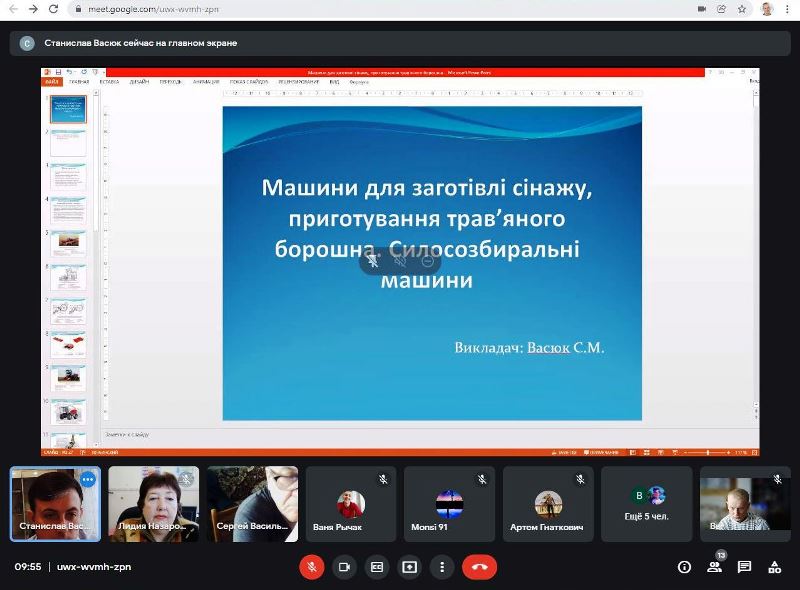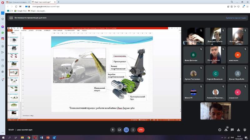 Васюк С. М. продемонстрував методику проведення онлайн лекції з дисципліни «Сільськогосподарські машини» на тему «Машини для заготівлі сінажу, приготування трав’яного борошна. Силосозбиральні машини». Використання презентації дозволило візуалізувати навчальний матеріал, показати наглядно будову і технологічний процес роботи кормозбирального і силосозбирального комбайнів. Пояснення викладача доповнювалося демонстрацією тематичних відеороликів: «Технологія заготівлі сінажу», «Робота кормозбирального комбайну КСК-600 "Палессе" SF60», «Автоматична система стеження заповнення кузова транспортного засобу Claas Jaguar» та інших.