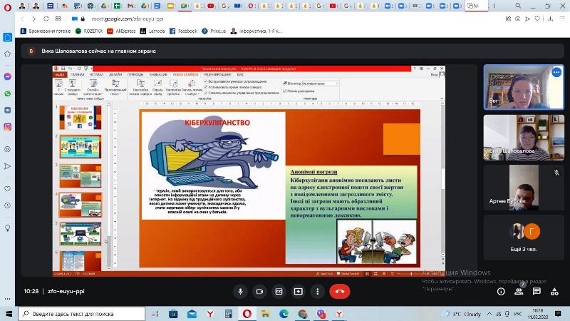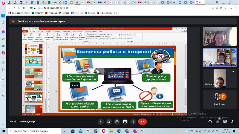 16.02.2022 р. викладач Олійник Вероніка Валеріївна провела відкрите заняття з використанням онлайнових інструментів: Moodle (платформа дистанційного навчання), Google Meet (інструмент онлайн трансляцій), Microsoft PowerPoint (створення та демонстрація презентацій).