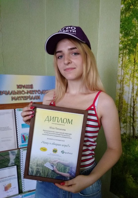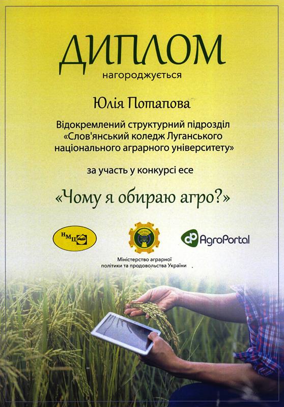 Студентка Слов’янського аграрного коледжу Потапова Юлія 11 червня 2019 року взяла участь в церемонії нагородження фіналістів Всеукраїнського конкурсу серед студентів «Чому я вибираю агро?», що відбулася в Міністерстві аграрної політики і продовольства України. Її есе посіло друге місце серед 97 робіт із 26 аграрних закладів України