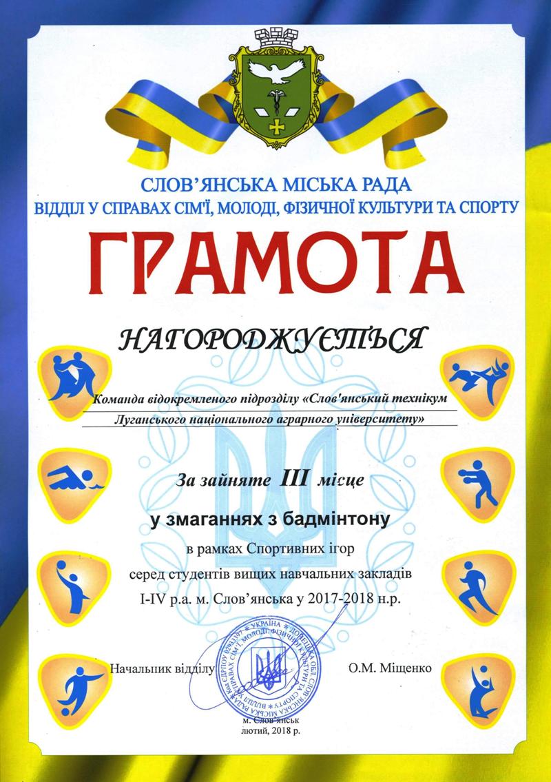 21 лютого в спортивній залі Слов’янського хіміко-механічного технікуму відбулися змагання з бадмінтону в рамках проведення Спортивних ігор міста Слов’янська серед студентів закладів вищої освіти у 2017-2018 навчальному році, в яких прийняли участь п’ять команд: Слов’янський технікум Луганського національного аграрного університету, Слов’янський коледж національного авіаційного університету, Слов’янський енергобудівний технікум, Слов’янський хіміко-механічний технікум, Донбаський державний педагогічний університет.