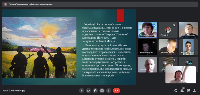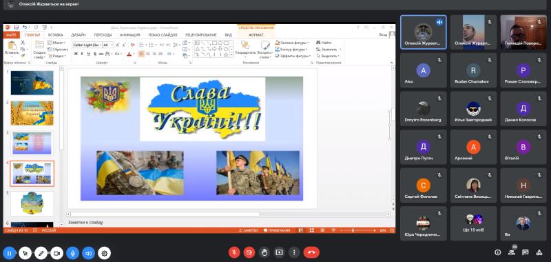 Студентам також демонстрували відеоматеріали, презентації про життя і побут козаків, про пам’ятні події та визначні здобутки українського війська, починаючи зі збройної агресії російської федерації на Сході України до подій сьогодення. Говорили про героїзм воїнів ЗСУ та інших силових відомств, ветеранів, добровольців, ветеранів, волонтерів, які сьогодні захищають територіальну цілісність України. Лунав Гімн України, патріотичні пісні та вірші.