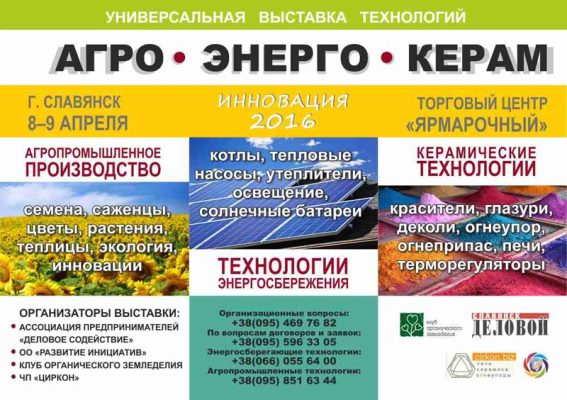 8-9 квітня у Торгівельному центрі «Ярмарковий» у Слов’янську відбулася Універсальна виставка технологій «Агро.Енерго.Керам-Інновація 2016», спрямована на активізацію ділового життя Слов’янська, на прискорення інформаційного обміну для бізнесу у вказаних галузях. Окремою метою виставки було розповісти про підприємницький та технологічний потенціал міста.