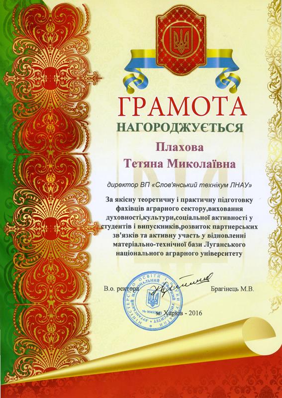 Рішенням Вченої ради Луганського національного аграрного університету (місто Харків) від 19 квітня 2017 року продовжено повноваження Плахової Тетяни Миколаївни на посаді директора технікуму.
