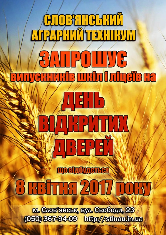 Відокремлений підрозділ "Слов'янський технікум Луганського національного аграрного університету" оголошує про проведення Дня відкритих дверей, який відбудеться 8 квітня 2017 року о 10-00.