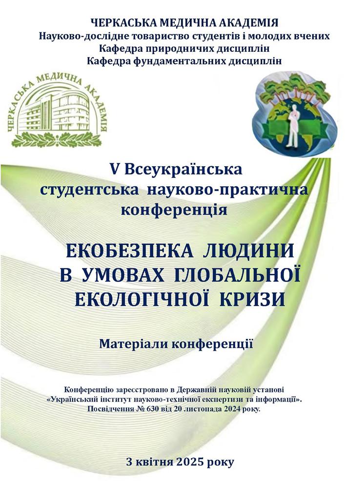Черкаська медична академія V Всеукраїнська студентська науково-практична конференція «Екобезпека людини в умовах глобальної екологічної кризи». Студент Зорін Дмитро. Стаття «Вплив січасних агротехнологій на стан грунтів і здоров'я людини» (3 години)