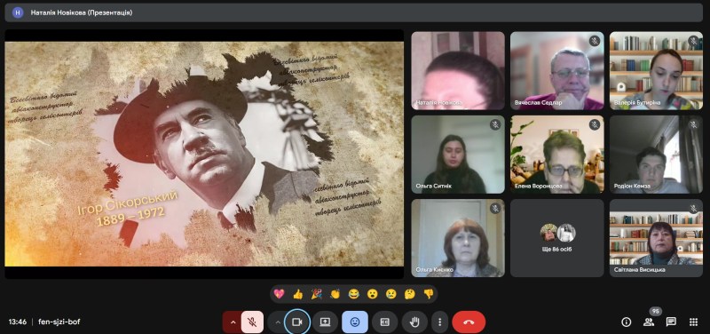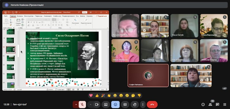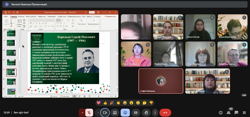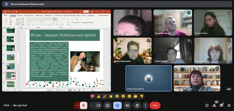 У вступному слові Наталія Володимирівна підкреслила важливість розвитку науки, а також роль українських учених у світовому науковому поступі. Далі студентки Павлигіна Ірина, Гейченко Діана та Гейченко Софія презентували доповіді про видатних українських учених-фізиків: Юрія Михайловича Котермака – одного з перших українських науковців епохи Відродження; Івана Павловича Пулюя – винахідника, який зробив значний внесок у розвиток рентгенівських досліджень; Євгена Оскаровича Патона, Сергія Павловича Корольова та Юрія Васильовича Кондратюка – видатних конструкторів і новаторів, чиї ідеї лягли в основу сучасних технологій зварювання та космічних польотів. Було продемонстровано також відео «Видатні українські вчені-фізики», що стало яскравим доповненням до виступів студентів.