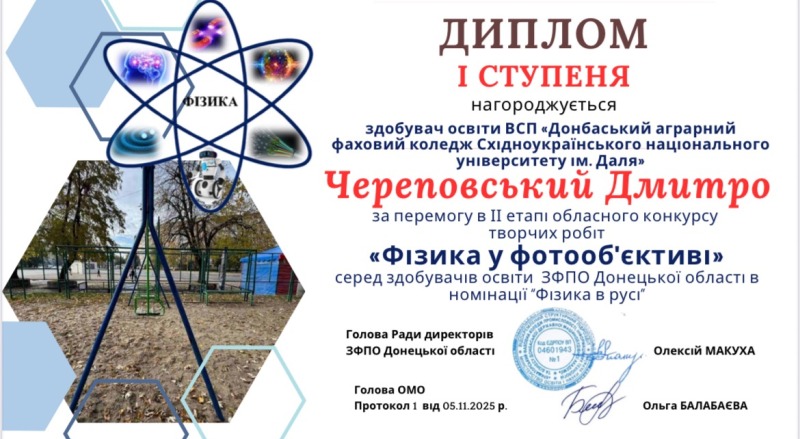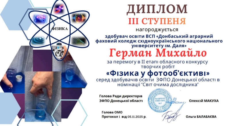 Під час заходу також були оголошені результати конкурсу «Фізика в фотооб’єктиві», який проводився на обласному методичному об’єднанні викладачів фізики. Череповський Дмитро (група 3Т924) здобув І місце у номінації «Фізика в русі», а Герман Михайло (група 1М925) — ІІІ місце у номінації «Світ очима дослідника».