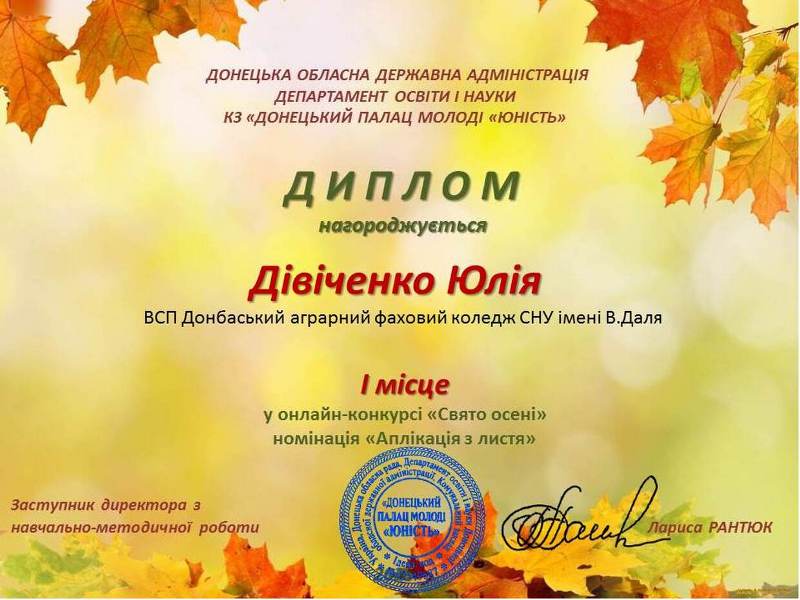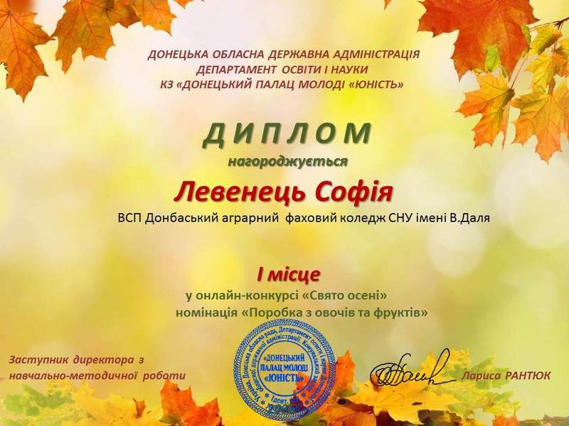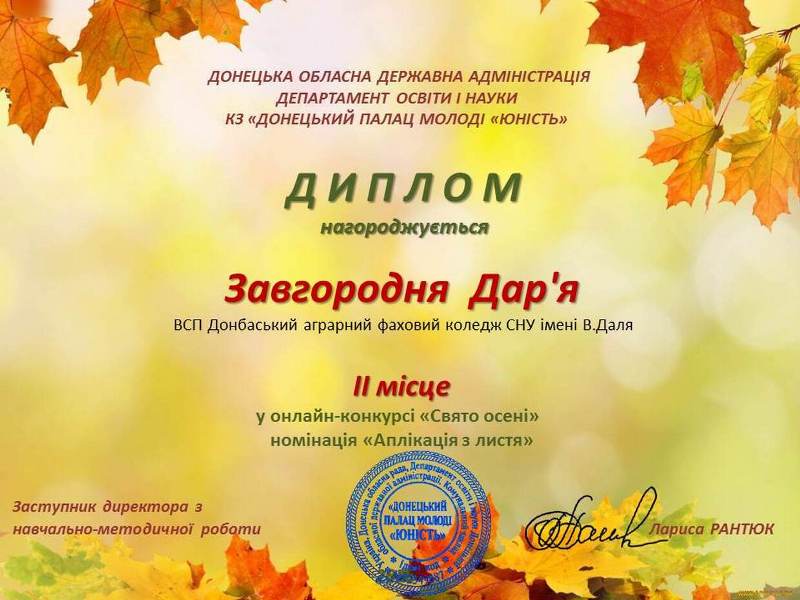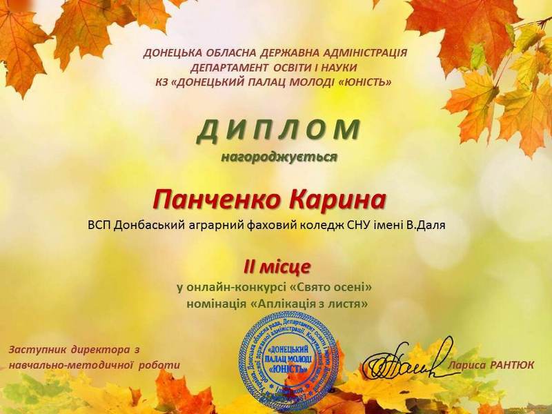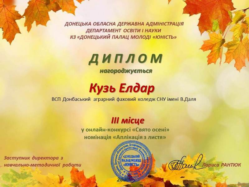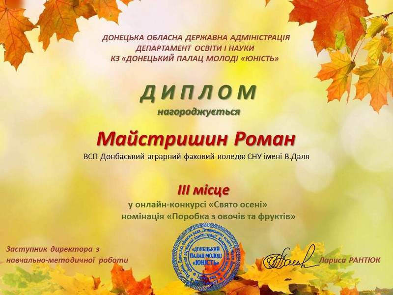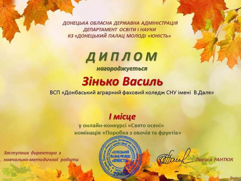 Здобувачі освіти нашого коледжу взяли активну участь в онлайн-конкурсі поробок із природного матеріалу «Свято осені», організованому Донецьким Палацом молоді «Юність» серед здобувачів освіти Донецької області.