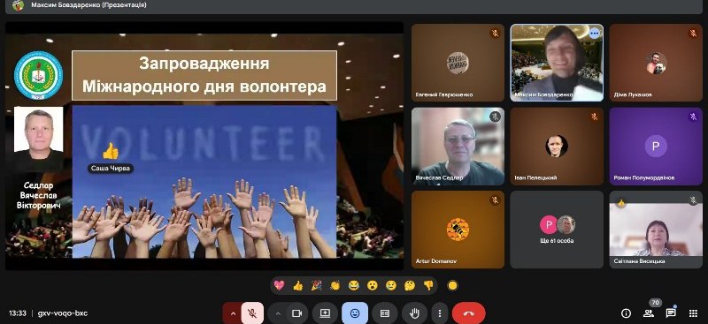 Студенти групи 2М1125 Седлар В.В. та Стрілецький М.О. представили змістовні доповіді про історію запровадження Міжнародного дня волонтера та ключові напрями діяльності волонтерських організацій. Їх виступи супроводжувалися яскравими презентаціями, а також відеоматеріалами про розвиток світового та українського волонтерського руху.