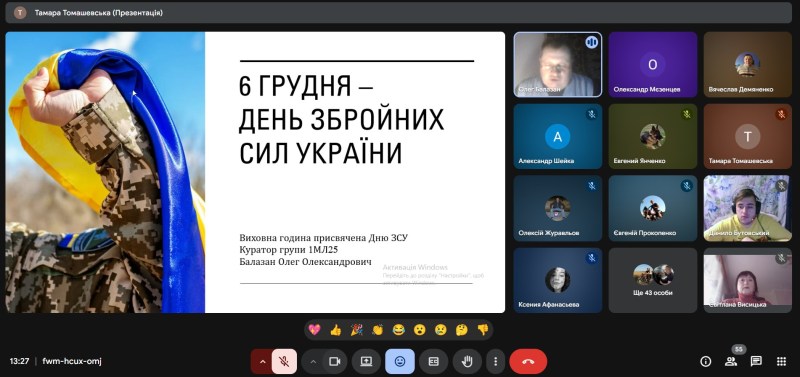 Студенти групи 1МЛ25 підготували змістовні доповіді про історію формування української армії та презентацію, що дозволило глибше розкрити історичні й сучасні аспекти теми. Присутні переглянули відеоматеріали, присвячені героїзму українських воїнів, виконанню сучасних бойових завдань. Лунали поетичні присвяти мужнім захисникам і захисницям, які щодня ризикують життям, оберігаючи наш мир. Учасники згадали легендарних кіборгів Донецького аеропорту – символ незламності українського духу. Пам’ять полеглих воїнів вшанували хвилиною мовчання.