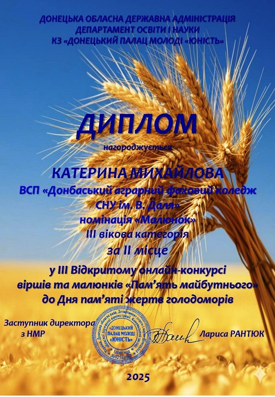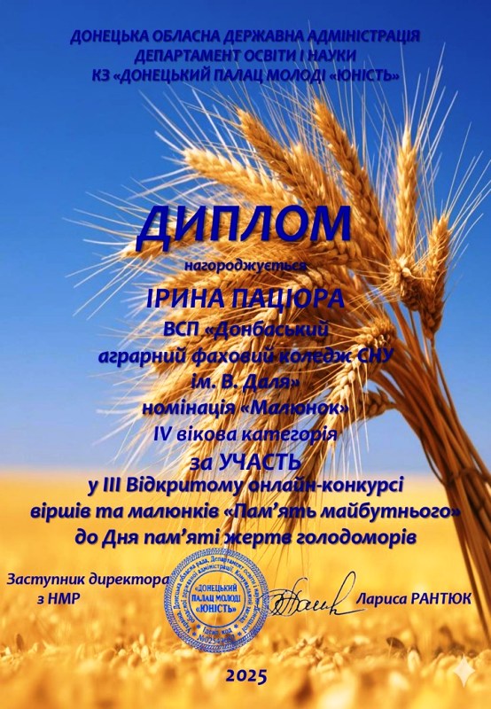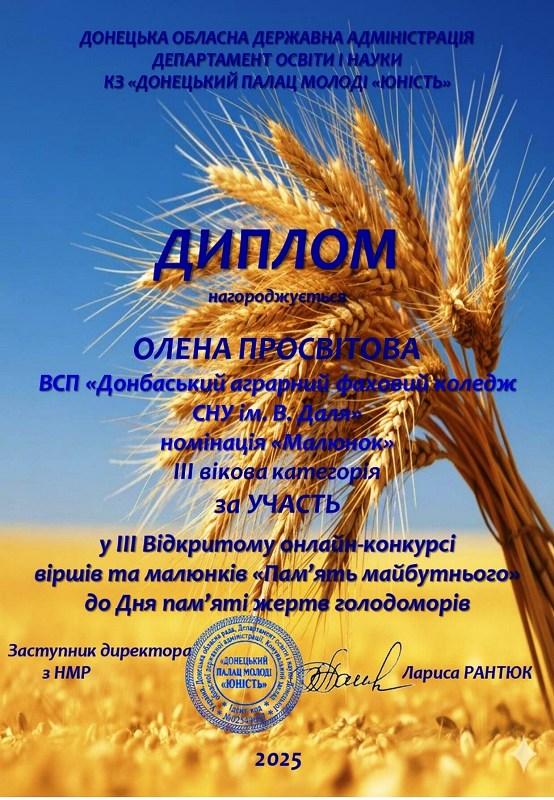 Здобувачі освіти нашого коледжу долучилися до ІІІ відкритого онлайн-конкурсу віршів та малюнків «Пам’ять майбутнього» до Дня пам’яті жертв голодоморів, організованого Донецьким Палацом молоді «Юність».