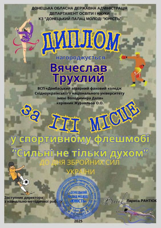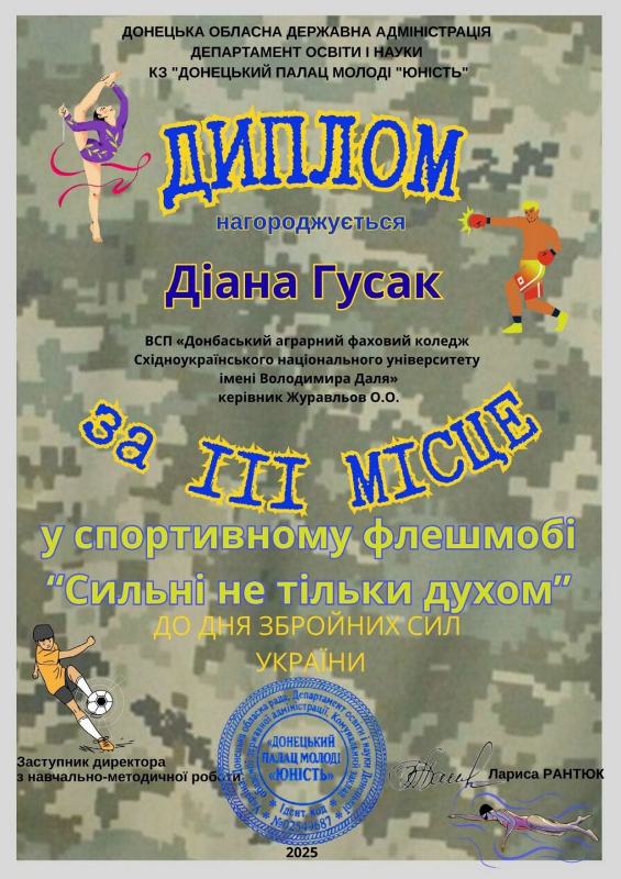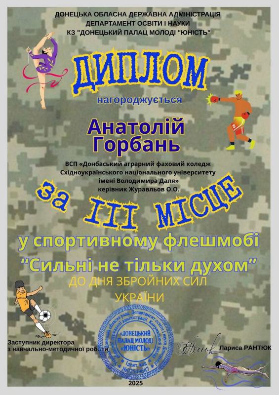 Досягнення наших здобувачів освіти ще раз підтверджують, що студентська молодь Донбаського аграрного фахового коледжу є активною, цілеспрямованою та фізично підготовленою.